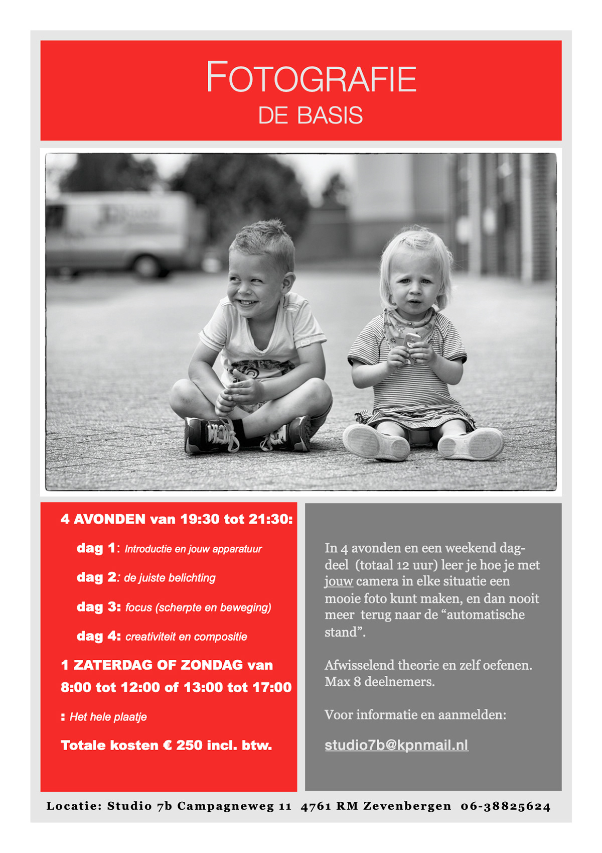 Wanneer er voldoende belangstelling is organiseer ik deze workshop basis-fotografie. Deze workshop wordt gegeven voor minimaal 4 en maximaal 8 deelnemers.